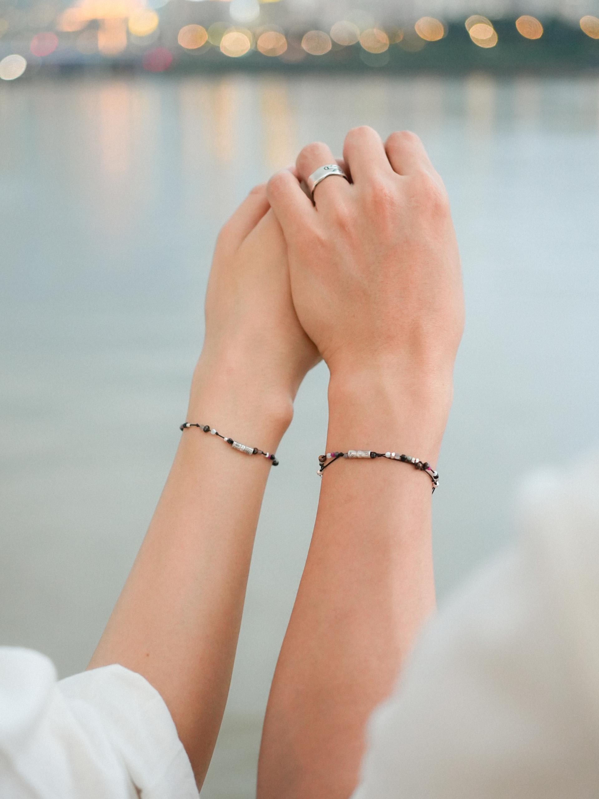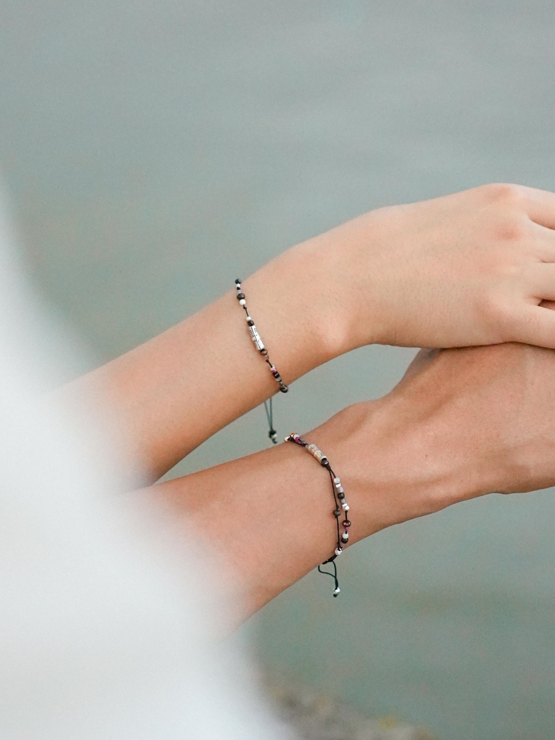 7월 탄생석 루비가 담긴 유니섹스 커플 실팔찌 세트입니다.